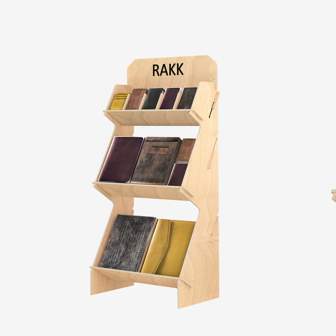 Mağazanızda dikey alanı verimli kullanmanızı sağlayan 120 cm boyunda 3 raflı teşhir standı, deri çanta, cüzdan ve defter sunumları için idealdir.